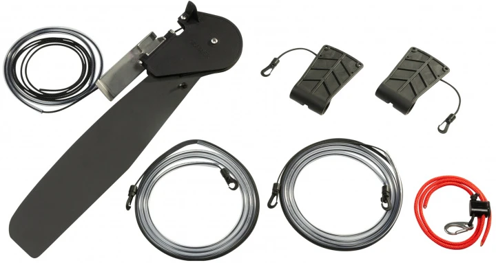 Lieferumfang: 2,5 mm eloxiertes Dural Steuerblatt, Magnesium Steuerkopf, Dural-Querstab, Steuerstift, Steuerleinen mit 2 Karabiner, Aufholerleine, Steuerleinen-Schutzschlauch, 2 Fußpedale für Stemmbügel (Farbe schwarz), Rückspann-Gummikabel mit Karabiner, ca. 1,3 kg.