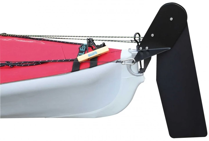 Moderne längsverstellbare Fußsteuereinrichtung aus Aluminium. Das lange schmale Steuerblatt hat eine gute Steuerwirkung, die auch bei hohen Wellen nicht beeinträchtigt ist. Das Steuerblatt kann bei Nichtbenutzung per Aufholleine hochgezogen werden (Flip Off).